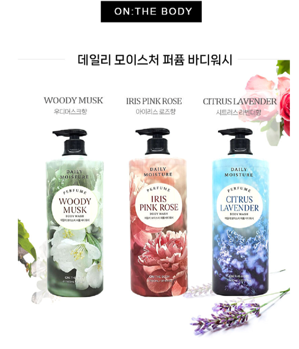 Hiện nay, đối với dòng DAILY MOISTURE PERFUME BODY WASH, ON: THE BODY đang cho ra mắt người dùng 3 loại sữa tắm tương ứng với 3 mùi hương quyến rũ khác nhau: IRIS PINK ROSE (hoa hồng), WOODY MUSK (gỗ xạ hương), CITRUS LAVENDER (hoa oải hương)