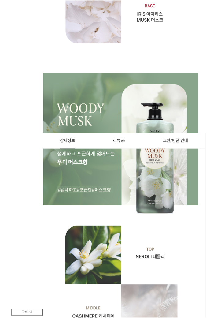 Hiện nay, đối với dòng DAILY MOISTURE PERFUME BODY WASH, ON: THE BODY đang cho ra mắt người dùng 3 loại sữa tắm tương ứng với 3 mùi hương quyến rũ khác nhau: IRIS PINK ROSE (hoa hồng), WOODY MUSK (gỗ xạ hương), CITRUS LAVENDER (hoa oải hương)
